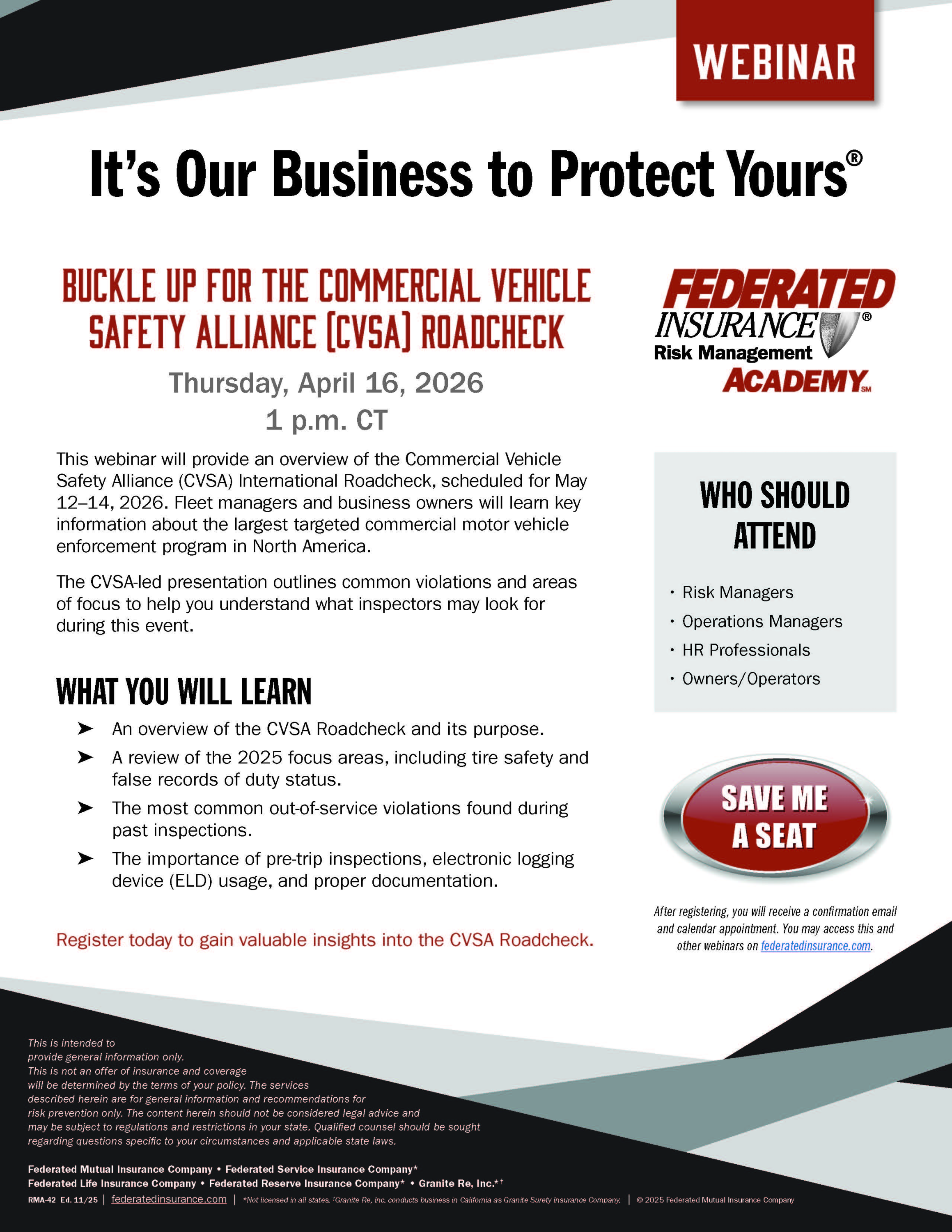 FEDERATED INSURANCE® SPONSORED WEBINAR | Buckle Up for the Commercial Vehicle Safety Alliance (CVSA) Roadcheck | Thursday, April 16, 2026