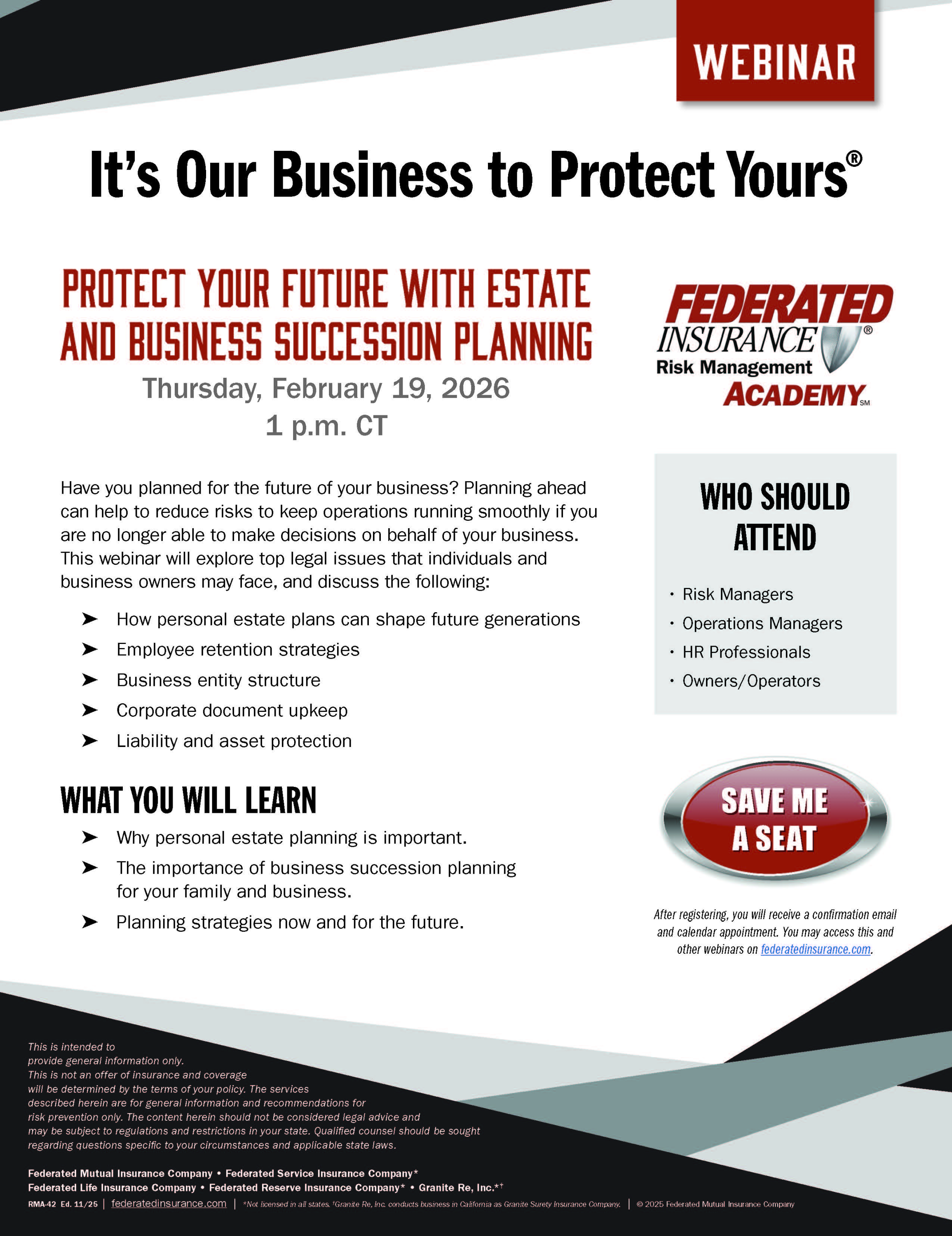 FEDERATED INSURANCE SPONSORED WEBINAR | Protect Your Future With Estate and Business Succession Planning | Thursday, February 19, 2026 | 1:00 PM